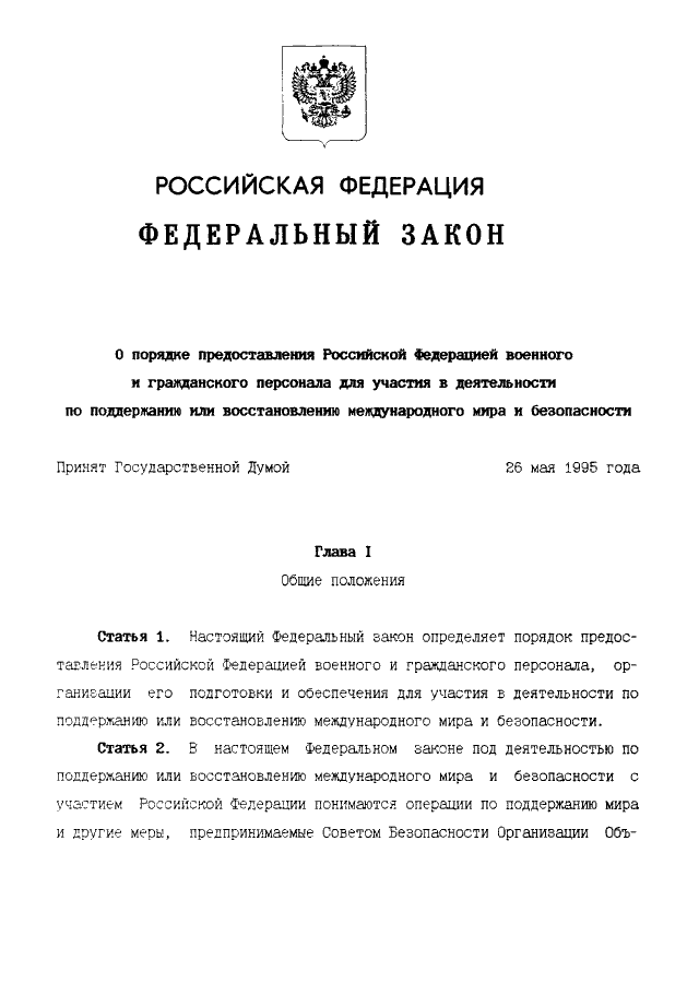 "О ПОРЯДКЕ ПРЕДОСТАВЛЕНИЯ РОССИЙСКОЙ ФЕДЕРАЦИЕЙ ВОЕННОГО И ГРАЖДАНСКОГО ПЕРСОНАЛА ДЛЯ УЧАСТИЯ В ДЕЯТЕЛЬНОСТИ ПО ПОДДЕРЖАНИЮ ИЛИ ВОССТАНОВЛЕНИЮ МЕЖДУНАРОДНОГО МИРА И БЕЗОПАСНОСТИ"