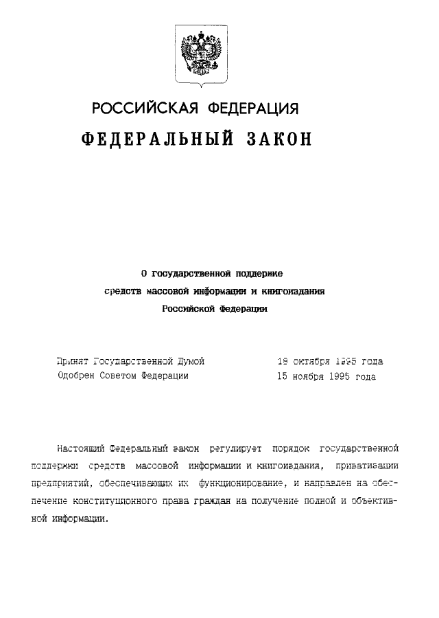 "О ГОСУДАРСТВЕННОЙ ПОДДЕРЖКЕ СРЕДСТВ МАССОВОЙ ИНФОРМАЦИИ И КНИГОИЗДАНИЯ РОССИЙСКОЙ ФЕДЕРАЦИИ"