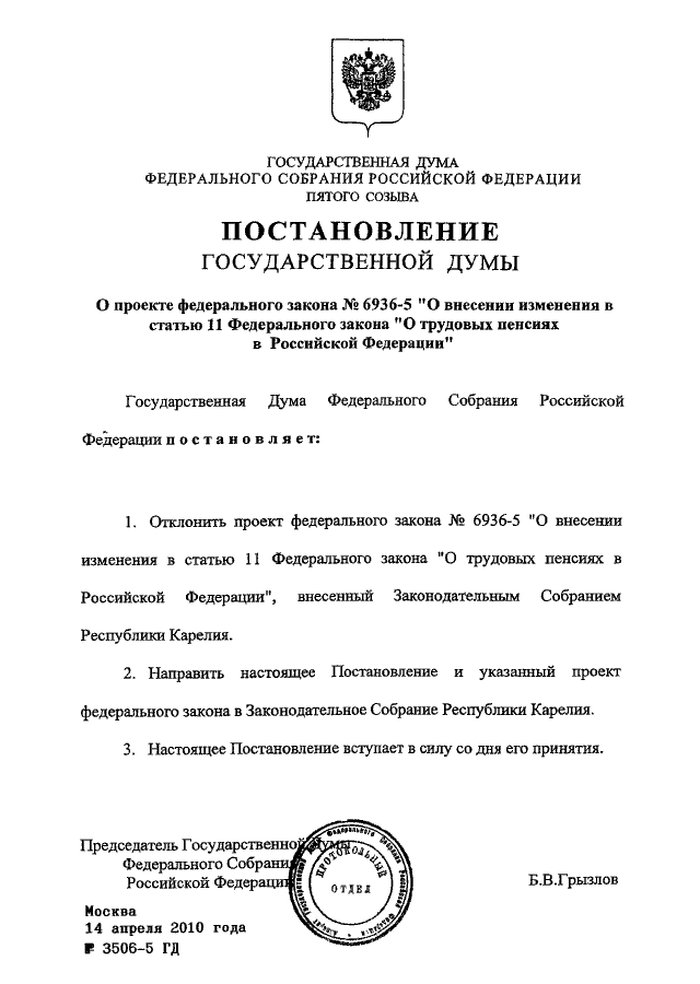 ПОСТАНОВЛЕНИЕ ГД ФС РФ от 14.04.2010 N 3506-5 ГД