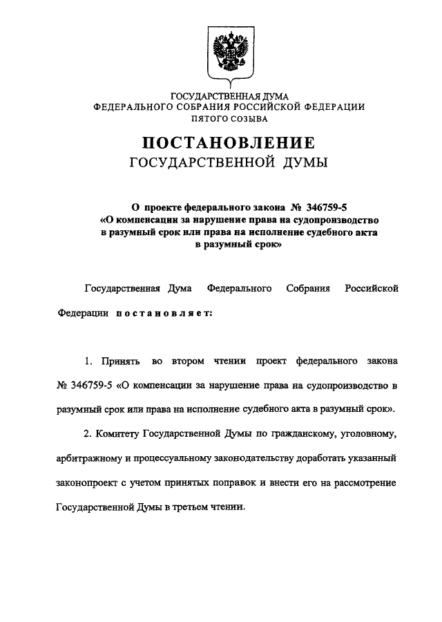 "О ПРОЕКТЕ ФЕДЕРАЛЬНОГО ЗАКОНА N 346759-5 "О КОМПЕНСАЦИИ ЗА НАРУШЕНИЕ ПРАВА НА СУДОПРОИЗВОДСТВО В РАЗУМНЫЙ СРОК ИЛИ ПРАВА НА ИСПОЛНЕНИЕ СУДЕБНОГО АКТА В РАЗУМНЫЙ СРОК"