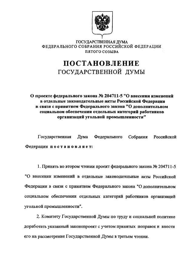 "О ПРОЕКТЕ ФЕДЕРАЛЬНОГО ЗАКОНА N 204711-5 "О ВНЕСЕНИИ ИЗМЕНЕНИЙ В