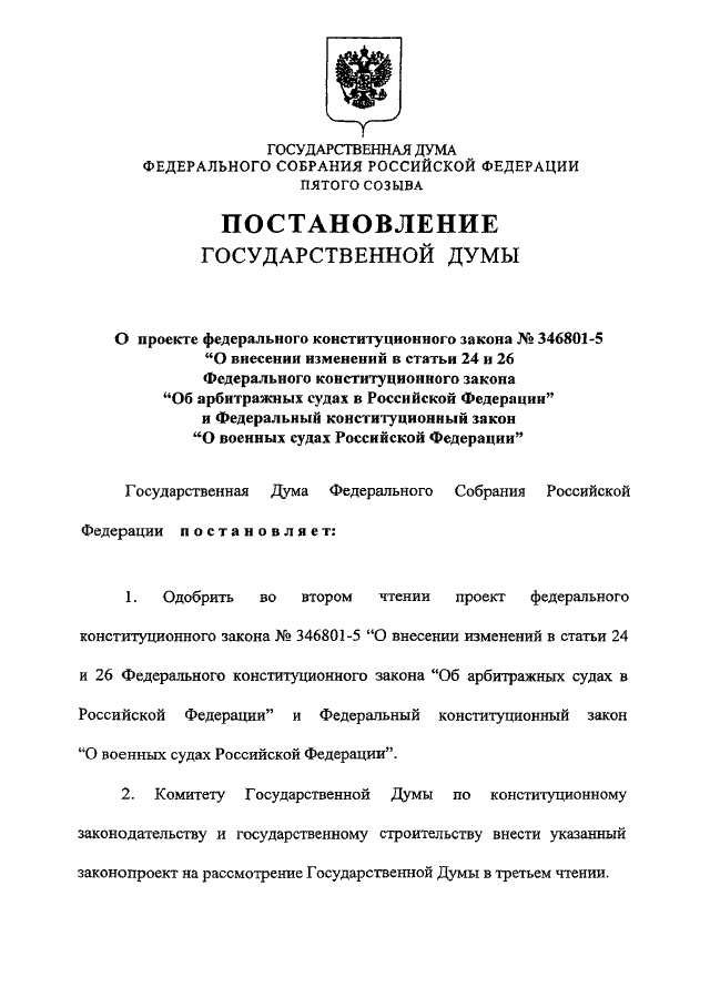 "О ПРОЕКТЕ ФЕДЕРАЛЬНОГО КОНСТИТУЦИОННОГО ЗАКОНА N 346801-5 "О