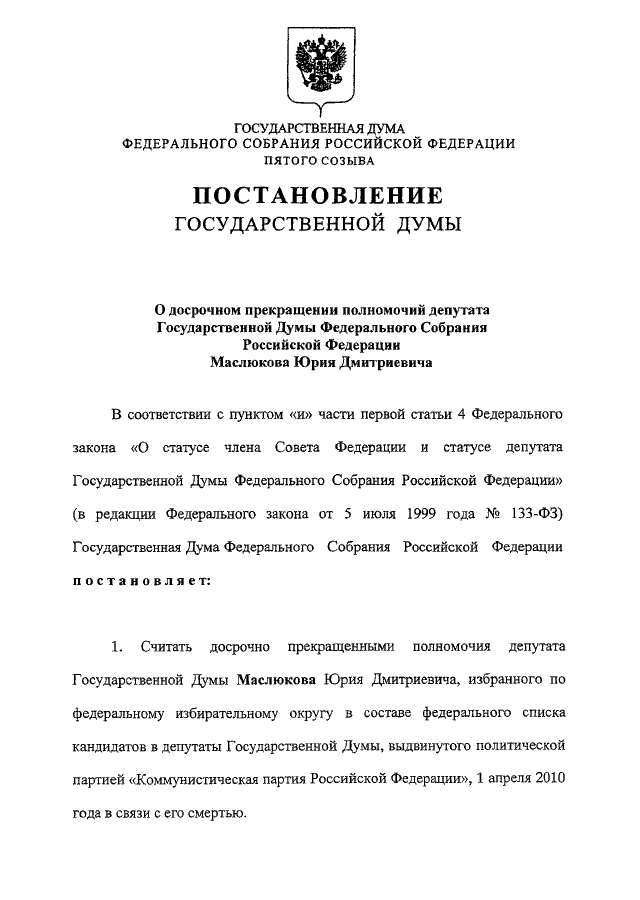 "О ДОСРОЧНОМ ПРЕКРАЩЕНИИ ПОЛНОМОЧИЙ ДЕПУТАТА ГОСУДАРСТВЕННОЙ ДУМЫ ФЕДЕРАЛЬНОГО СОБРАНИЯ РОССИЙСКОЙ ФЕДЕРАЦИИ МАСЛЮКОВА ЮРИЯ ДМИТРИЕВИЧА"