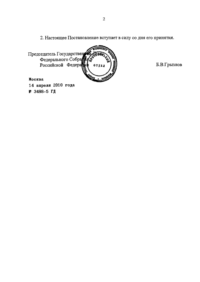 ПОСТАНОВЛЕНИЕ ГД ФС РФ от 14.04.2010 N 3488-5 ГД
