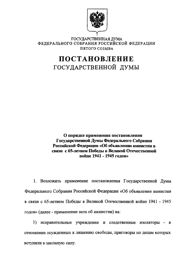 "О ПОРЯДКЕ ПРИМЕНЕНИЯ ПОСТАНОВЛЕНИЯ ГОСУДАРСТВЕННОЙ ДУМЫ ФЕДЕРАЛЬНОГО СОБРАНИЯ РОССИЙСКОЙ ФЕДЕРАЦИИ "ОБ ОБЪЯВЛЕНИИ АМНИСТИИ В СВЯЗИ С 65-ЛЕТИЕМ ПОБЕДЫ В ВЕЛИКОЙ ОТЕЧЕСТВЕННОЙ ВОЙНЕ 1941 - 1945 ГОДОВ"