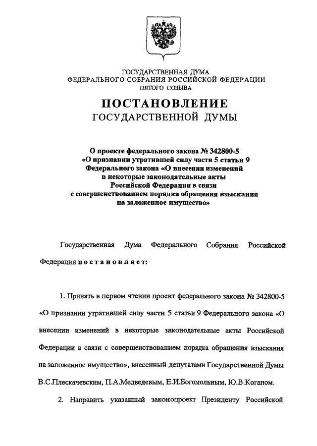 "О ПРОЕКТЕ ФЕДЕРАЛЬНОГО ЗАКОНА N 342800-5 "О ПРИЗНАНИИ УТРАТИВШЕЙ