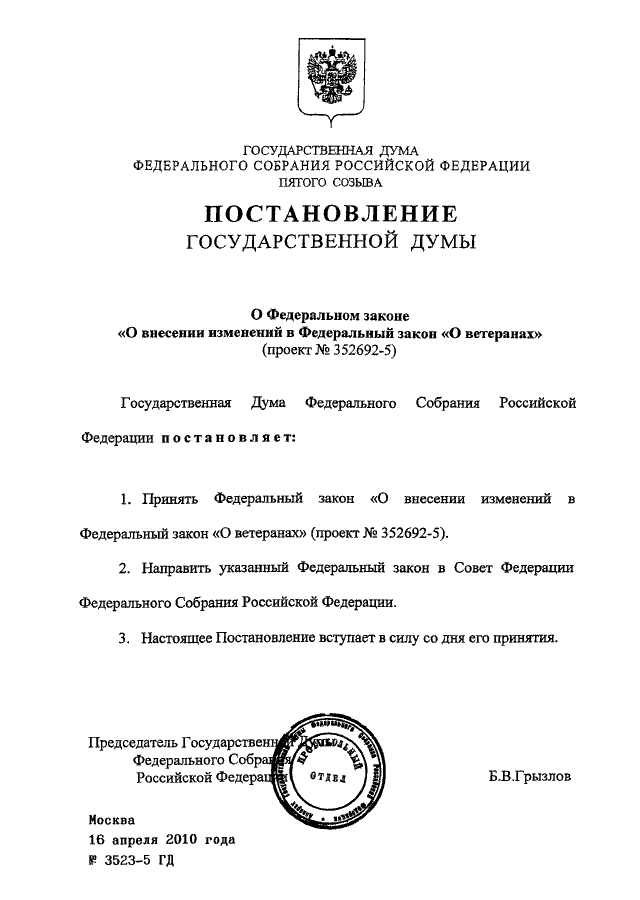 ПОСТАНОВЛЕНИЕ ГД ФС РФ от 16.04.2010 N 3523-5 ГД