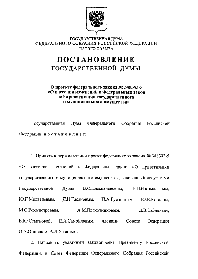"О ПРОЕКТЕ ФЕДЕРАЛЬНОГО ЗАКОНА N 348393-5 "О ВНЕСЕНИИ ИЗМЕНЕНИЙ В ФЕДЕРАЛЬНЫЙ ЗАКОН "О ПРИВАТИЗАЦИИ ГОСУДАРСТВЕННОГО И МУНИЦИПАЛЬНОГО ИМУЩЕСТВА"
