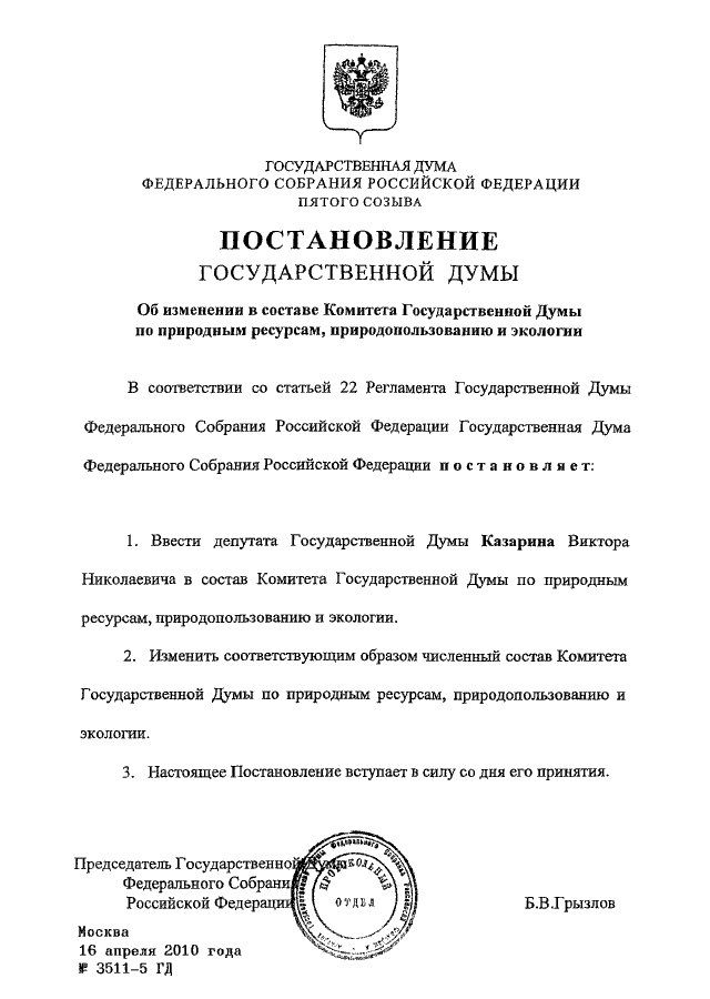 ПОСТАНОВЛЕНИЕ ГД ФС РФ от 16.04.2010 N 3511-5 ГД