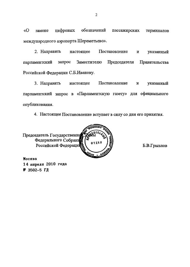 "О ПАРЛАМЕНТСКОМ ЗАПРОСЕ ГОСУДАРСТВЕННОЙ ДУМЫ ФЕДЕРАЛЬНОГО СОБРАНИЯ РОССИЙСКОЙ ФЕДЕРАЦИИ ЗАМЕСТИТЕЛЮ ПРЕДСЕДАТЕЛЯ ПРАВИТЕЛЬСТВА РОССИЙСКОЙ ФЕДЕРАЦИИ С.Б. ИВАНОВУ "О ЗАМЕНЕ ЦИФРОВЫХ ОБОЗНАЧЕНИЙ ПАССАЖИРСКИХ ТЕРМИНАЛОВ МЕЖДУНАРОДНОГО АЭРОПОРТА ШЕРЕМЕТЬЕВО"
