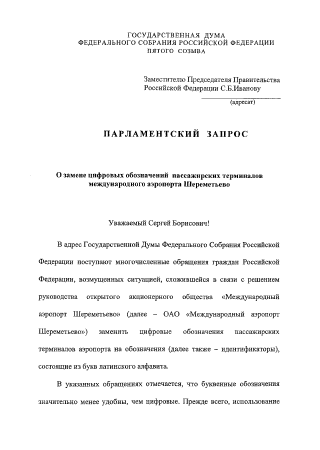 "О ПАРЛАМЕНТСКОМ ЗАПРОСЕ ГОСУДАРСТВЕННОЙ ДУМЫ ФЕДЕРАЛЬНОГО СОБРАНИЯ РОССИЙСКОЙ ФЕДЕРАЦИИ ЗАМЕСТИТЕЛЮ ПРЕДСЕДАТЕЛЯ ПРАВИТЕЛЬСТВА РОССИЙСКОЙ ФЕДЕРАЦИИ С.Б. ИВАНОВУ "О ЗАМЕНЕ ЦИФРОВЫХ ОБОЗНАЧЕНИЙ ПАССАЖИРСКИХ ТЕРМИНАЛОВ МЕЖДУНАРОДНОГО АЭРОПОРТА ШЕРЕМЕТЬЕВО"