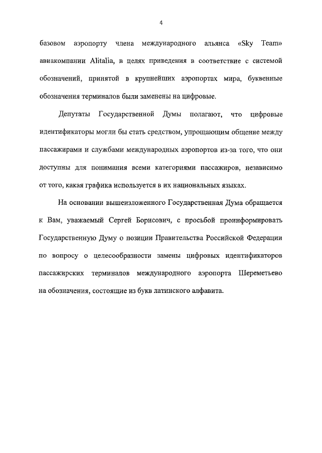 "О ПАРЛАМЕНТСКОМ ЗАПРОСЕ ГОСУДАРСТВЕННОЙ ДУМЫ ФЕДЕРАЛЬНОГО СОБРАНИЯ РОССИЙСКОЙ ФЕДЕРАЦИИ ЗАМЕСТИТЕЛЮ ПРЕДСЕДАТЕЛЯ ПРАВИТЕЛЬСТВА РОССИЙСКОЙ ФЕДЕРАЦИИ С.Б. ИВАНОВУ "О ЗАМЕНЕ ЦИФРОВЫХ ОБОЗНАЧЕНИЙ ПАССАЖИРСКИХ ТЕРМИНАЛОВ МЕЖДУНАРОДНОГО АЭРОПОРТА ШЕРЕМЕТЬЕВО"