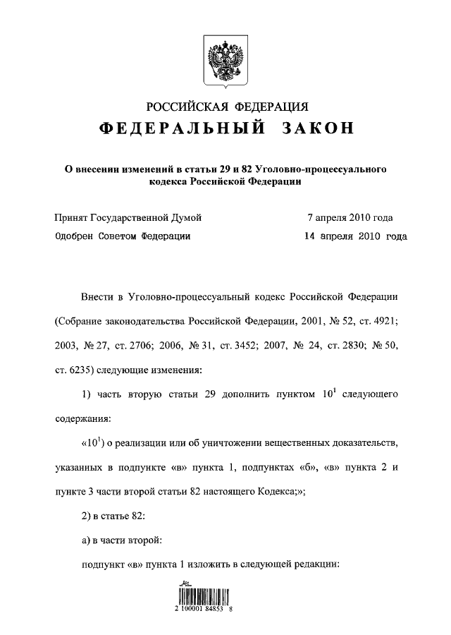 "О ВНЕСЕНИИ ИЗМЕНЕНИЙ В СТАТЬИ 29 И 82 УГОЛОВНО - ПРОЦЕССУАЛЬНОГО КОДЕКСА РОССИЙСКОЙ ФЕДЕРАЦИИ"