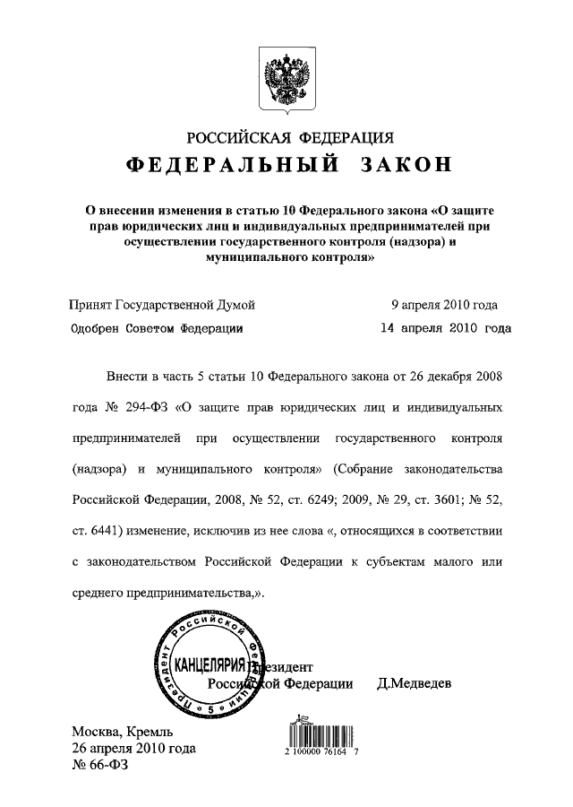 ФЕДЕРАЛЬНЫЙ ЗАКОН от 26.04.2010 N 66-ФЗ