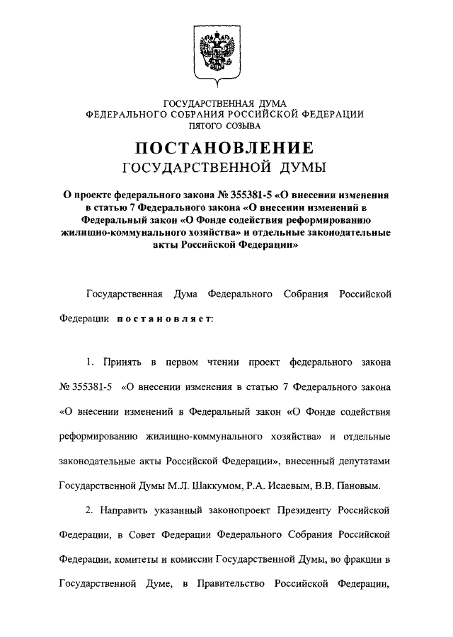 "О ПРОЕКТЕ ФЕДЕРАЛЬНОГО ЗАКОНА N 355381-5 "О ВНЕСЕНИИ ИЗМЕНЕНИЯ В СТАТЬЮ 7 ФЕДЕРАЛЬНОГО ЗАКОНА "О ВНЕСЕНИИ ИЗМЕНЕНИЙ В ФЕДЕРАЛЬНЫЙ ЗАКОН "О ФОНДЕ СОДЕЙСТВИЯ РЕФОРМИРОВАНИЮ ЖИЛИЩНО - КОММУНАЛЬНОГО ХОЗЯЙСТВА" И ОТДЕЛЬНЫЕ ЗАКОНОДАТЕЛЬНЫЕ АКТЫ РОССИЙСКОЙ ФЕДЕРАЦИИ"