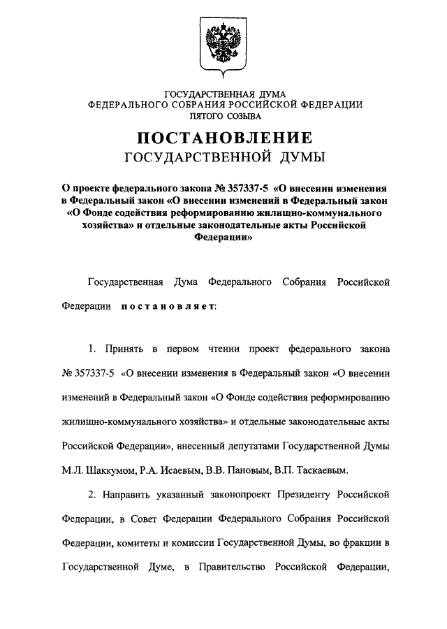 "О ПРОЕКТЕ ФЕДЕРАЛЬНОГО ЗАКОНА N 357337-5 "О ВНЕСЕНИИ ИЗМЕНЕНИЯ В