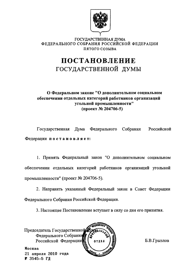 ПОСТАНОВЛЕНИЕ ГД ФС РФ от 21.04.2010 N 3545-5 ГД