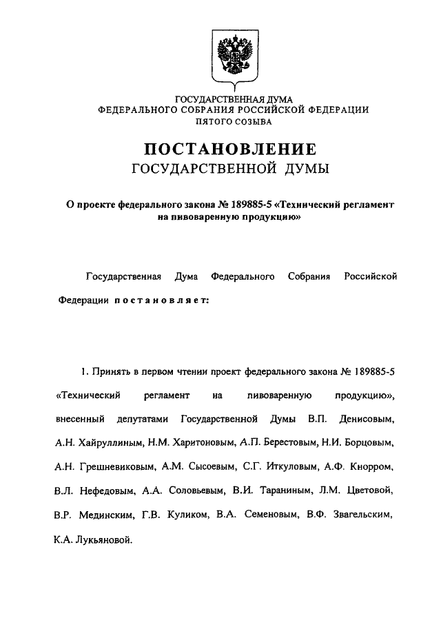 "О ПРОЕКТЕ ФЕДЕРАЛЬНОГО ЗАКОНА N 189885-5 "ТЕХНИЧЕСКИЙ РЕГЛАМЕНТ НА ПИВОВАРЕННУЮ ПРОДУКЦИЮ"