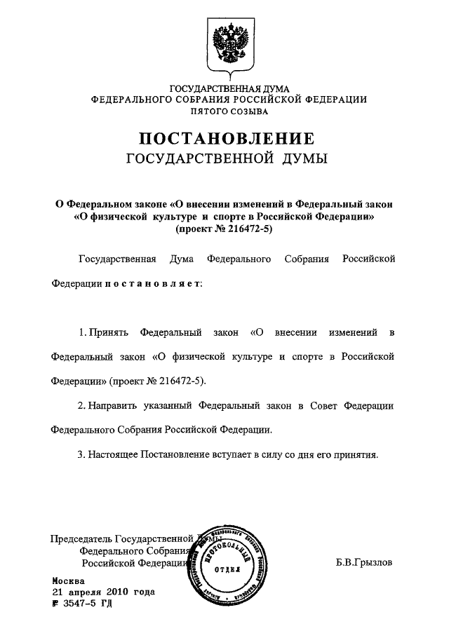 ПОСТАНОВЛЕНИЕ ГД ФС РФ от 21.04.2010 N 3547-5 ГД