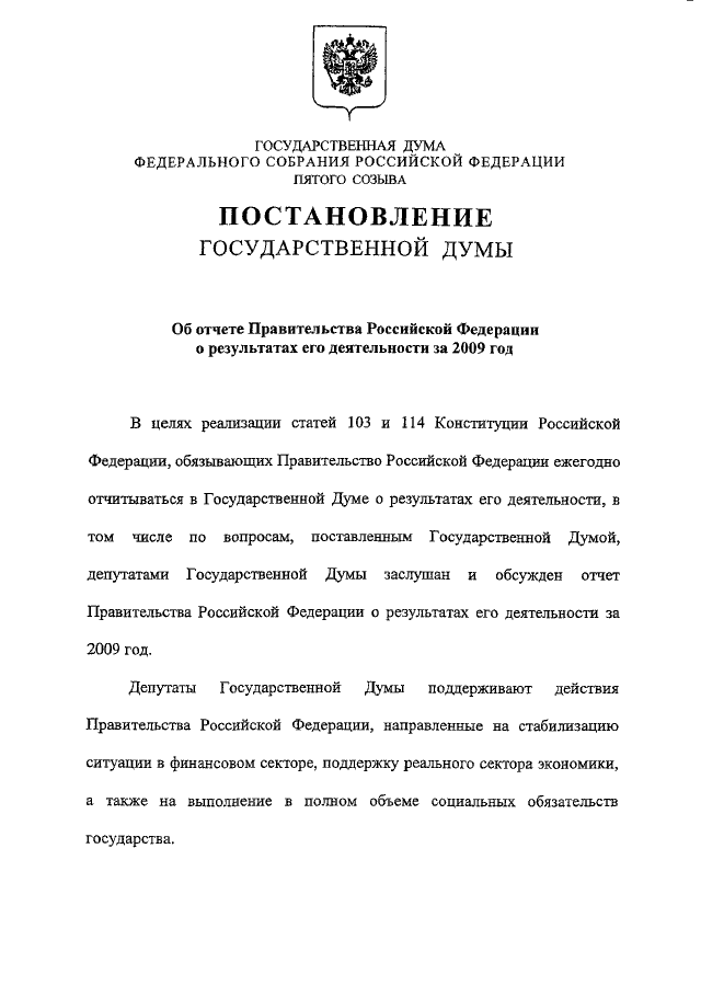 "ОБ ОТЧЕТЕ ПРАВИТЕЛЬСТВА РОССИЙСКОЙ ФЕДЕРАЦИИ О РЕЗУЛЬТАТАХ ЕГО ДЕЯТЕЛЬНОСТИ ЗА 2009 ГОД"