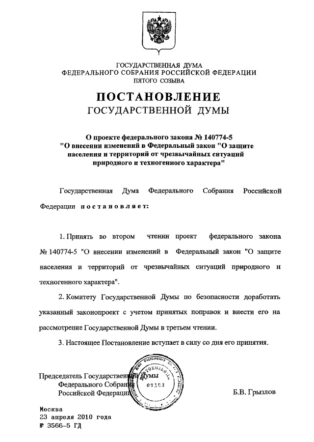 ПОСТАНОВЛЕНИЕ ГД ФС РФ от 23.04.2010 N 3566-5 ГД