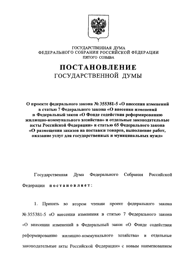 "О ПРОЕКТЕ ФЕДЕРАЛЬНОГО ЗАКОНА N 355381-5 "О ВНЕСЕНИИ ИЗМЕНЕНИЙ В СТАТЬЮ 7 ФЕДЕРАЛЬНОГО ЗАКОНА "О ВНЕСЕНИИ ИЗМЕНЕНИЙ В ФЕДЕРАЛЬНЫЙ ЗАКОН "О ФОНДЕ СОДЕЙСТВИЯ РЕФОРМИРОВАНИЮ ЖИЛИЩНО - КОММУНАЛЬНОГО ХОЗЯЙСТВА" И ОТДЕЛЬНЫЕ ЗАКОНОДАТЕЛЬНЫЕ АКТЫ РОССИЙСКОЙ ФЕДЕРАЦИИ" И СТАТЬЮ 65 ФЕДЕРАЛЬНОГО ЗАКОНА "О РАЗМЕЩЕНИИ ЗАКАЗОВ НА ПОСТАВКИ ТОВАРОВ, ВЫПОЛНЕНИЕ РАБОТ, ОКАЗАНИЕ УСЛУГ ДЛЯ ГОСУДАРСТВЕННЫХ И МУНИЦИПАЛЬНЫХ НУЖД"