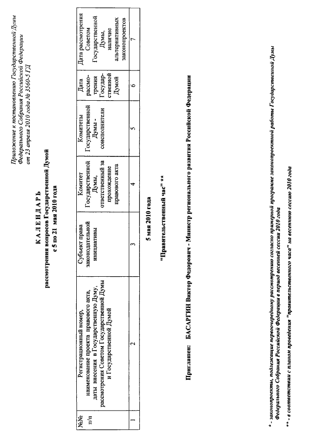 "О КАЛЕНДАРЕ РАССМОТРЕНИЯ ВОПРОСОВ ГОСУДАРСТВЕННОЙ ДУМОЙ С 5 ПО 21 МАЯ 2010 ГОДА"
