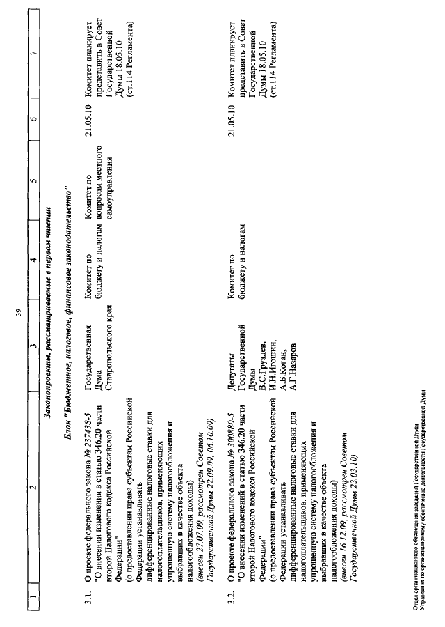 "О КАЛЕНДАРЕ РАССМОТРЕНИЯ ВОПРОСОВ ГОСУДАРСТВЕННОЙ ДУМОЙ С 5 ПО 21 МАЯ 2010 ГОДА"