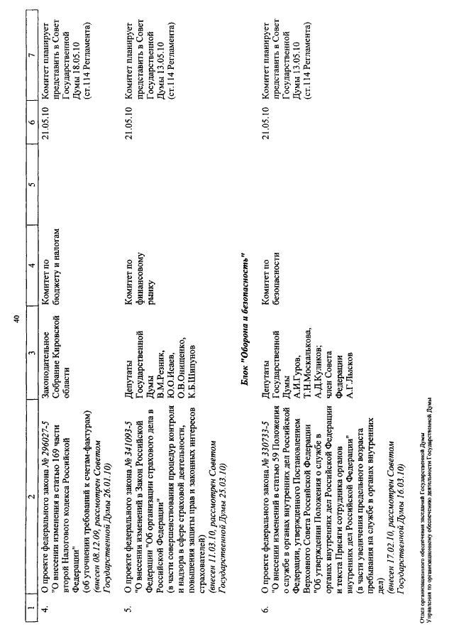 "О КАЛЕНДАРЕ РАССМОТРЕНИЯ ВОПРОСОВ ГОСУДАРСТВЕННОЙ ДУМОЙ С 5 ПО 21 МАЯ 2010 ГОДА"