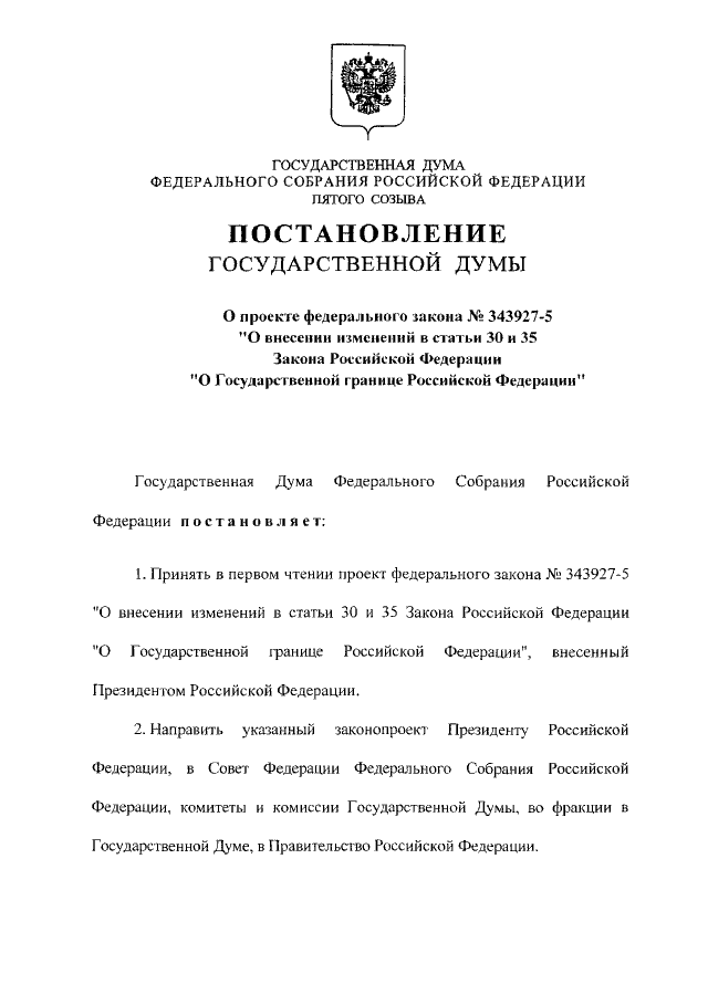 "О ПРОЕКТЕ ФЕДЕРАЛЬНОГО ЗАКОНА N 343927-5 "О ВНЕСЕНИИ ИЗМЕНЕНИЙ В СТАТЬИ 30 И 35 ЗАКОНА РОССИЙСКОЙ ФЕДЕРАЦИИ "О ГОСУДАРСТВЕННОЙ ГРАНИЦЕ РОССИЙСКОЙ ФЕДЕРАЦИИ"