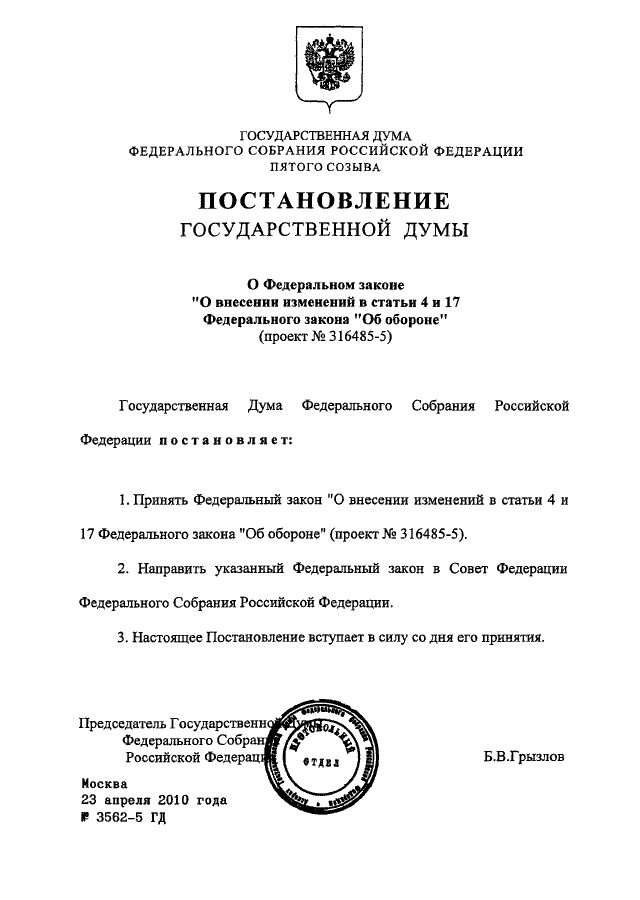 ПОСТАНОВЛЕНИЕ ГД ФС РФ от 23.04.2010 N 3562-5 ГД