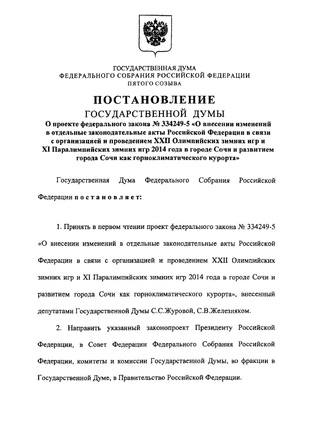 "О ПРОЕКТЕ ФЕДЕРАЛЬНОГО ЗАКОНА N 334249-5 "О ВНЕСЕНИИ ИЗМЕНЕНИЙ В ОТДЕЛЬНЫЕ ЗАКОНОДАТЕЛЬНЫЕ АКТЫ РОССИЙСКОЙ ФЕДЕРАЦИИ В СВЯЗИ С ОРГАНИЗАЦИЕЙ И ПРОВЕДЕНИЕМ XXII ОЛИМПИЙСКИХ ЗИМНИХ ИГР И XI ПАРАЛИМПИЙСКИХ ЗИМНИХ ИГР 2014 ГОДА В ГОРОДЕ СОЧИ И РАЗВИТИЕМ ГОРОДА СОЧИ КАК ГОРНОКЛИМАТИЧЕСКОГО КУРОРТА"