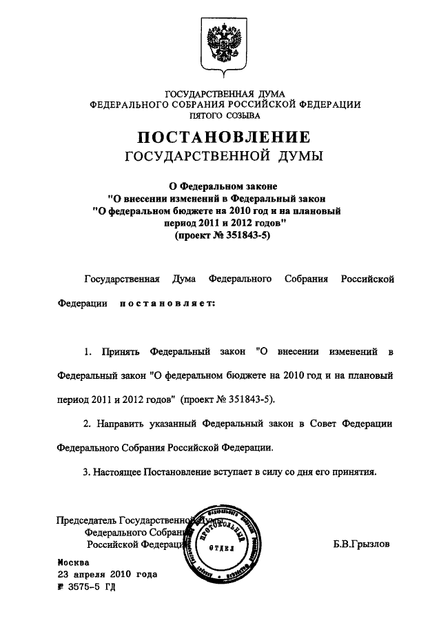 ПОСТАНОВЛЕНИЕ ГД ФС РФ от 23.04.2010 N 3575-5 ГД