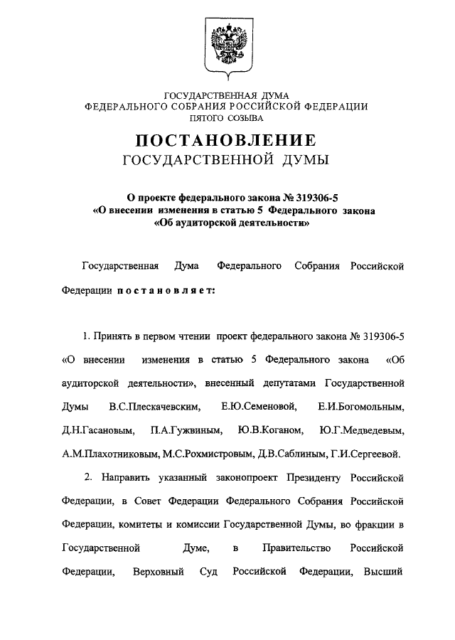 "О ПРОЕКТЕ ФЕДЕРАЛЬНОГО ЗАКОНА N 319306-5 "О ВНЕСЕНИИ ИЗМЕНЕНИЯ В СТАТЬЮ 5 ФЕДЕРАЛЬНОГО ЗАКОНА "ОБ АУДИТОРСКОЙ ДЕЯТЕЛЬНОСТИ"