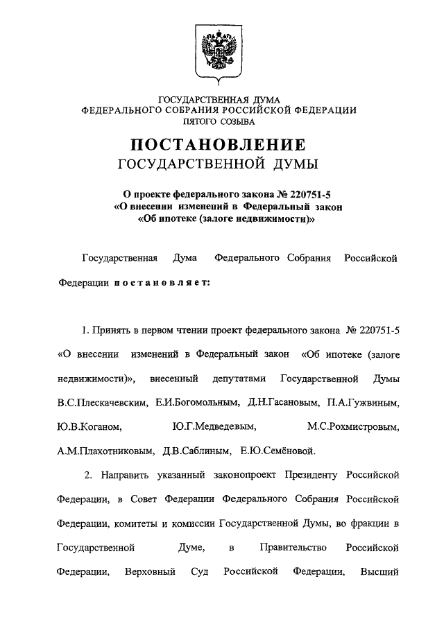 "О ПРОЕКТЕ ФЕДЕРАЛЬНОГО ЗАКОНА N 220751-5 "О ВНЕСЕНИИ ИЗМЕНЕНИЙ В ФЕДЕРАЛЬНЫЙ ЗАКОН "ОБ ИПОТЕКЕ (ЗАЛОГЕ НЕДВИЖИМОСТИ)"