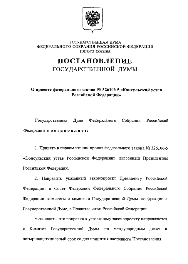 "О ПРОЕКТЕ ФЕДЕРАЛЬНОГО ЗАКОНА N 326106-5 "КОНСУЛЬСКИЙ УСТАВ РОССИЙСКОЙ ФЕДЕРАЦИИ"