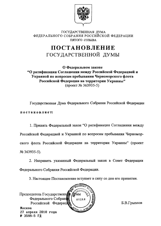 "О ФЕДЕРАЛЬНОМ ЗАКОНЕ "О РАТИФИКАЦИИ СОГЛАШЕНИЯ МЕЖДУ РОССИЙСКОЙ ФЕДЕРАЦИЕЙ И УКРАИНОЙ ПО ВОПРОСАМ ПРЕБЫВАНИЯ ЧЕРНОМОРСКОГО ФЛОТА РОССИЙСКОЙ ФЕДЕРАЦИИ НА ТЕРРИТОРИИ УКРАИНЫ" (ПРОЕКТ N 363935-5)"