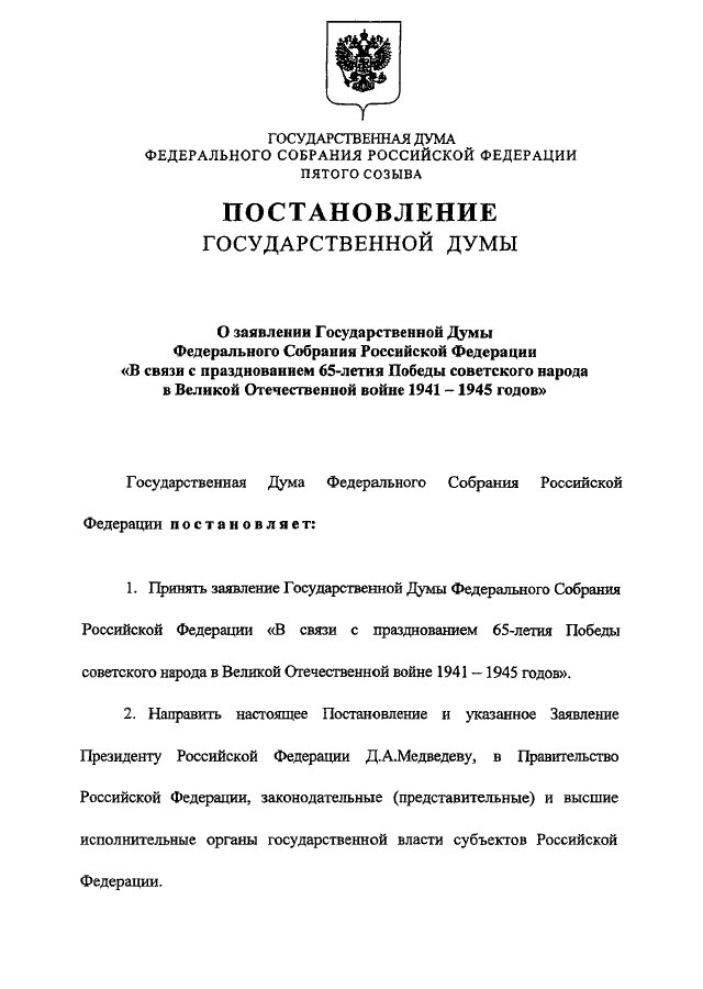 "О ЗАЯВЛЕНИИ ГОСУДАРСТВЕННОЙ ДУМЫ ФЕДЕРАЛЬНОГО СОБРАНИЯ РОССИЙСКОЙ ФЕДЕРАЦИИ "В СВЯЗИ С ПРАЗДНОВАНИЕМ 65-ЛЕТИЯ ПОБЕДЫ СОВЕТСКОГО НАРОДА В ВЕЛИКОЙ ОТЕЧЕСТВЕННОЙ ВОЙНЕ 1941 - 1945 ГОДОВ"