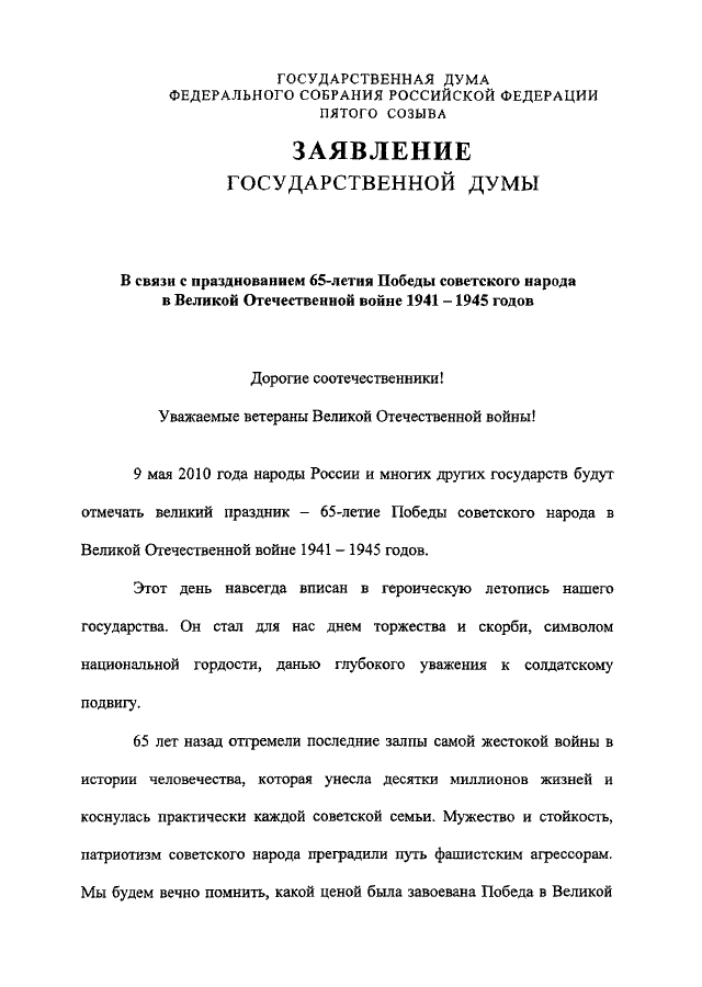 "О ЗАЯВЛЕНИИ ГОСУДАРСТВЕННОЙ ДУМЫ ФЕДЕРАЛЬНОГО СОБРАНИЯ РОССИЙСКОЙ ФЕДЕРАЦИИ "В СВЯЗИ С ПРАЗДНОВАНИЕМ 65-ЛЕТИЯ ПОБЕДЫ СОВЕТСКОГО НАРОДА В ВЕЛИКОЙ ОТЕЧЕСТВЕННОЙ ВОЙНЕ 1941 - 1945 ГОДОВ"