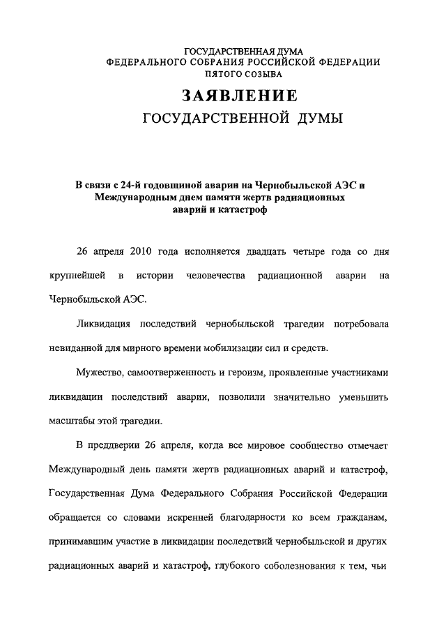 "О ЗАЯВЛЕНИИ ГОСУДАРСТВЕННОЙ ДУМЫ ФЕДЕРАЛЬНОГО СОБРАНИЯ РОССИЙСКОЙ ФЕДЕРАЦИИ "В СВЯЗИ С 24-Й ГОДОВЩИНОЙ АВАРИИ НА ЧЕРНОБЫЛЬСКОЙ АЭС И МЕЖДУНАРОДНЫМ ДНЕМ ПАМЯТИ ЖЕРТВ РАДИАЦИОННЫХ АВАРИЙ И КАТАСТРОФ"