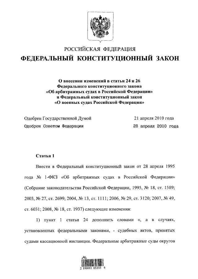 "О ВНЕСЕНИИ ИЗМЕНЕНИЙ В СТАТЬИ 24 И 26 ФЕДЕРАЛЬНОГО КОНСТИТУЦИОННОГО ЗАКОНА "ОБ АРБИТРАЖНЫХ СУДАХ В РОССИЙСКОЙ ФЕДЕРАЦИИ" И ФЕДЕРАЛЬНЫЙ КОНСТИТУЦИОННЫЙ ЗАКОН "О ВОЕННЫХ СУДАХ РОССИЙСКОЙ ФЕДЕРАЦИИ"