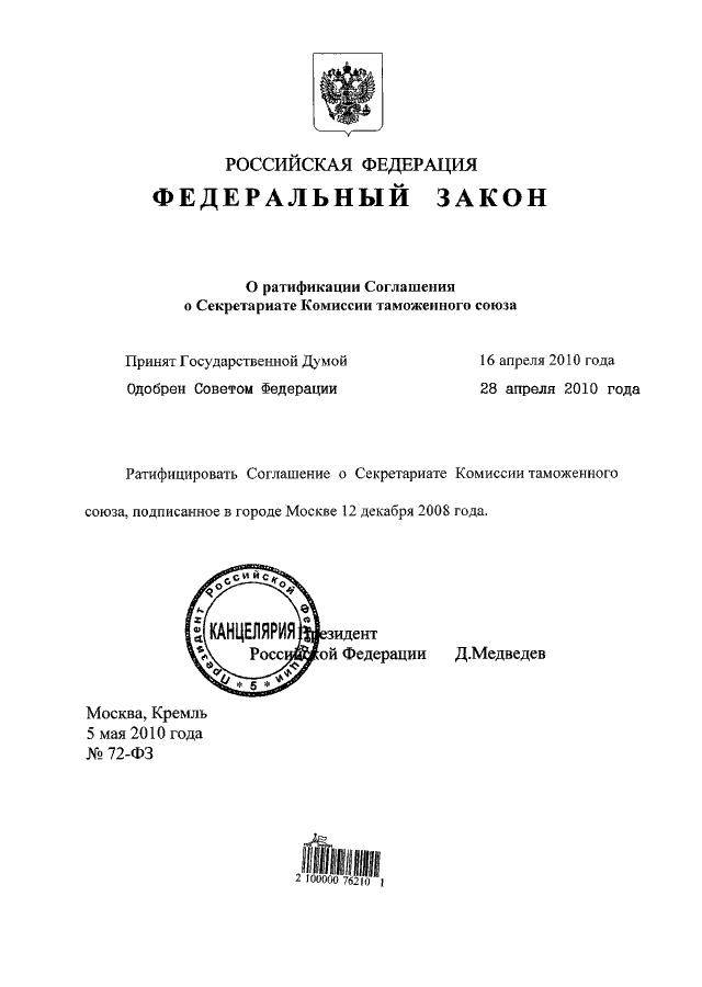 ФЕДЕРАЛЬНЫЙ ЗАКОН от 05.05.2010 N 72-ФЗ