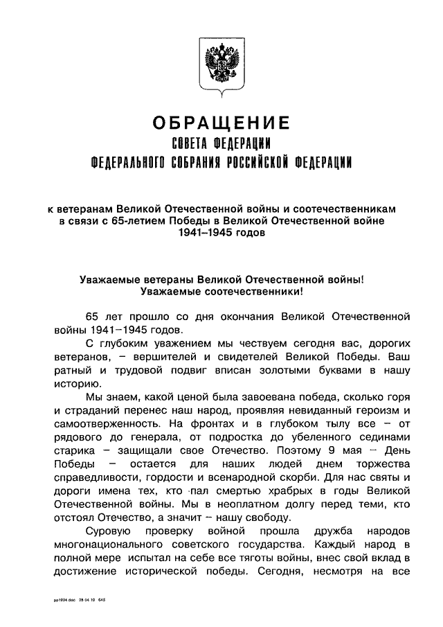 "К ВЕТЕРАНАМ ВЕЛИКОЙ ОТЕЧЕСТВЕННОЙ ВОЙНЫ И СООТЕЧЕСТВЕННИКАМ В СВЯЗИ С 65-ЛЕТИЕМ ПОБЕДЫ В ВЕЛИКОЙ ОТЕЧЕСТВЕННОЙ ВОЙНЕ 1941 - 1945 ГОДОВ"