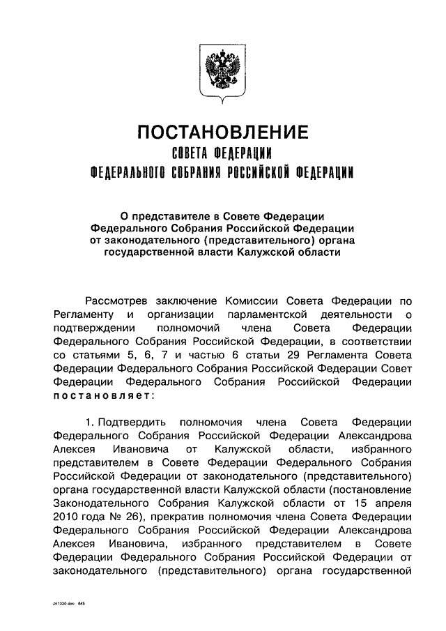 "О ПРЕДСТАВИТЕЛЕ В СОВЕТЕ ФЕДЕРАЦИИ ФЕДЕРАЛЬНОГО СОБРАНИЯ РОССИЙСКОЙ ФЕДЕРАЦИИ ОТ ЗАКОНОДАТЕЛЬНОГО (ПРЕДСТАВИТЕЛЬНОГО) ОРГАНА ГОСУДАРСТВЕННОЙ ВЛАСТИ КАЛУЖСКОЙ ОБЛАСТИ"