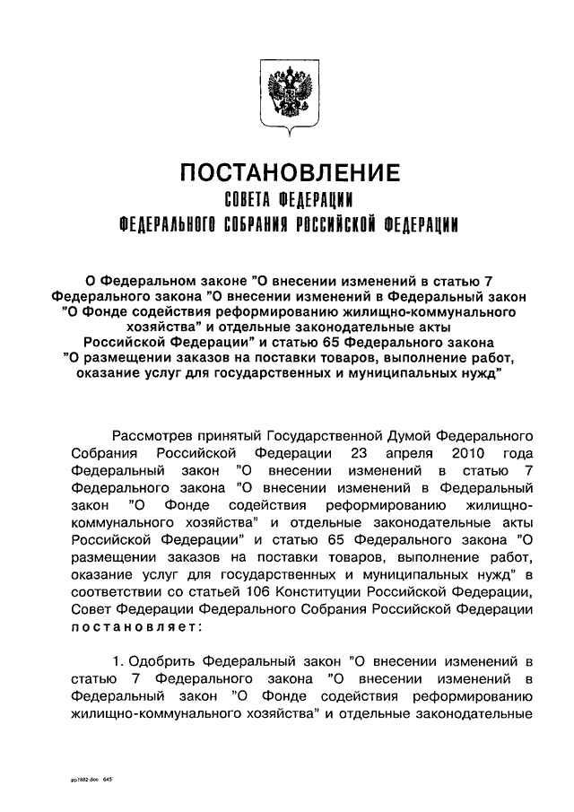"О ФЕДЕРАЛЬНОМ ЗАКОНЕ "О ВНЕСЕНИИ ИЗМЕНЕНИЙ В СТАТЬЮ 7 ФЕДЕРАЛЬНОГО ЗАКОНА "О ВНЕСЕНИИ ИЗМЕНЕНИЙ В ФЕДЕРАЛЬНЫЙ ЗАКОН "О ФОНДЕ СОДЕЙСТВИЯ РЕФОРМИРОВАНИЮ ЖИЛИЩНО - КОММУНАЛЬНОГО ХОЗЯЙСТВА" И ОТДЕЛЬНЫЕ ЗАКОНОДАТЕЛЬНЫЕ АКТЫ РОССИЙСКОЙ ФЕДЕРАЦИИ" И СТАТЬЮ 65 ФЕДЕРАЛЬНОГО ЗАКОНА "О РАЗМЕЩЕНИИ ЗАКАЗОВ НА ПОСТАВКИ ТОВАРОВ, ВЫПОЛНЕНИЕ РАБОТ, ОКАЗАНИЕ УСЛУГ ДЛЯ ГОСУДАРСТВЕННЫХ И МУНИЦИПАЛЬНЫХ НУЖД"