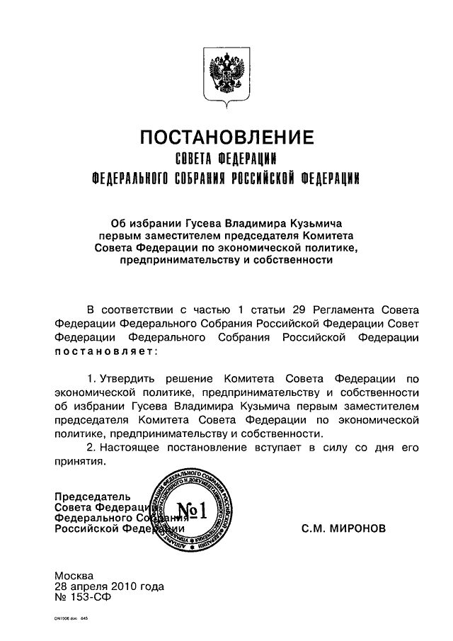 "ОБ ИЗБРАНИИ ГУСЕВА ВЛАДИМИРА КУЗЬМИЧА ПЕРВЫМ ЗАМЕСТИТЕЛЕМ ПРЕДСЕДАТЕЛЯ КОМИТЕТА СОВЕТА ФЕДЕРАЦИИ ПО ЭКОНОМИЧЕСКОЙ ПОЛИТИКЕ, ПРЕДПРИНИМАТЕЛЬСТВУ И СОБСТВЕННОСТИ"
