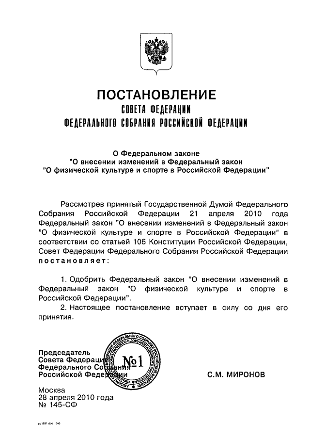 ПОСТАНОВЛЕНИЕ СФ ФС РФ от 28.04.2010 N 145-СФ