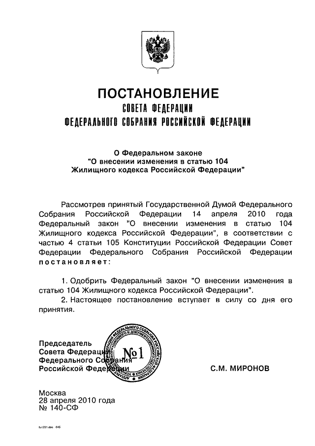 ПОСТАНОВЛЕНИЕ СФ ФС РФ от 28.04.2010 N 140-СФ
