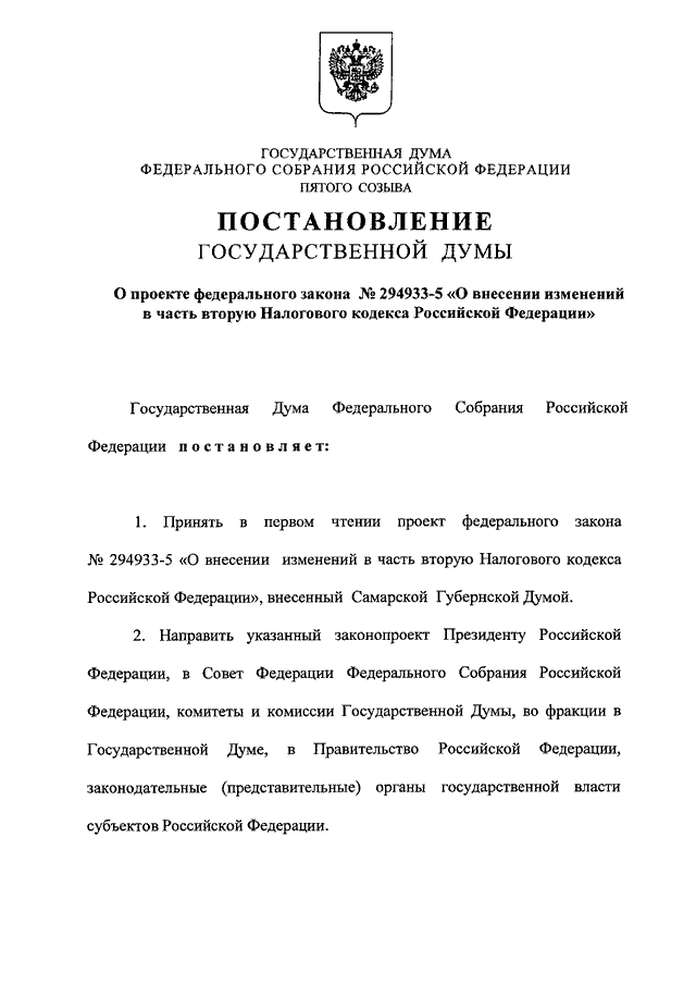 "О ПРОЕКТЕ ФЕДЕРАЛЬНОГО ЗАКОНА N 294933-5 "О ВНЕСЕНИИ ИЗМЕНЕНИЙ В ЧАСТЬ ВТОРУЮ НАЛОГОВОГО КОДЕКСА РОССИЙСКОЙ ФЕДЕРАЦИИ"