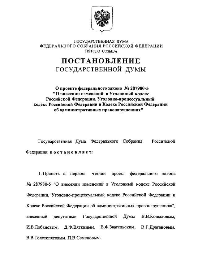 "О ПРОЕКТЕ ФЕДЕРАЛЬНОГО ЗАКОНА N 287980-5 "О ВНЕСЕНИИ ИЗМЕНЕНИЙ В